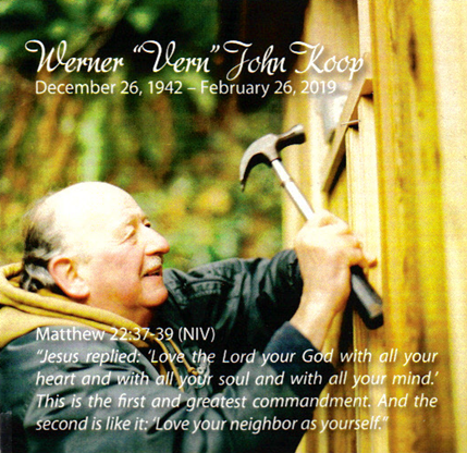 A quote Vern valued and lived by, son Mark said, goes this way: “work for a cause, not applause; live life to express not impress; don't strive to make your presence noticed, just make your absence felt.” That would describe Vern Koop. And, one could add, by doing so he made faith in Jesus attractive and believable.